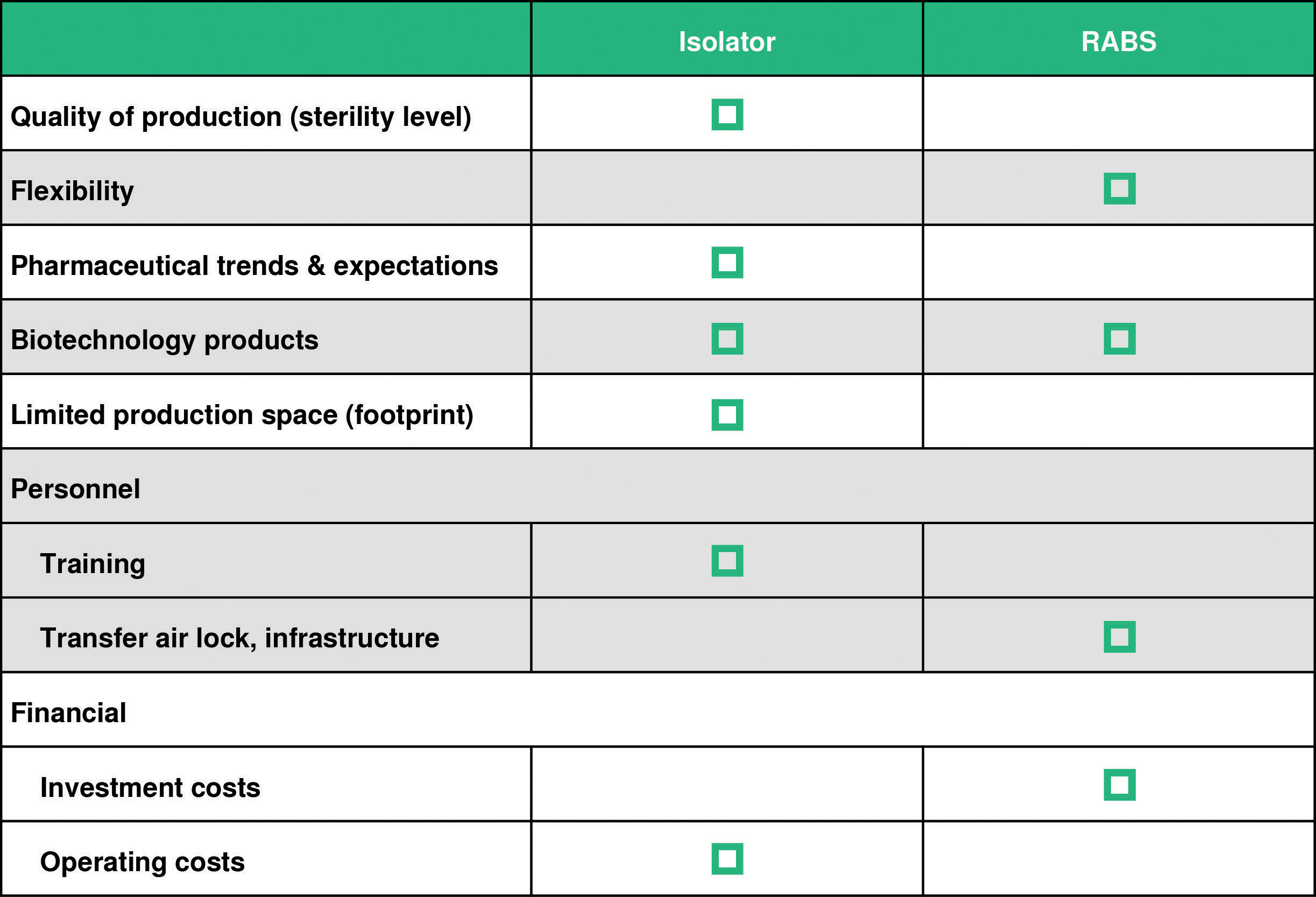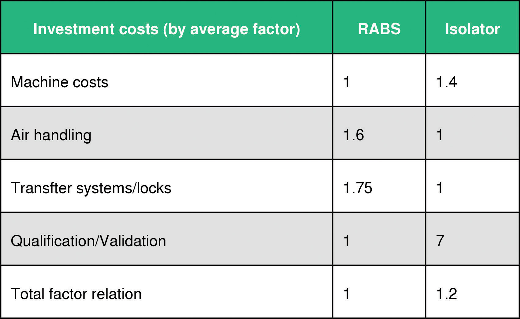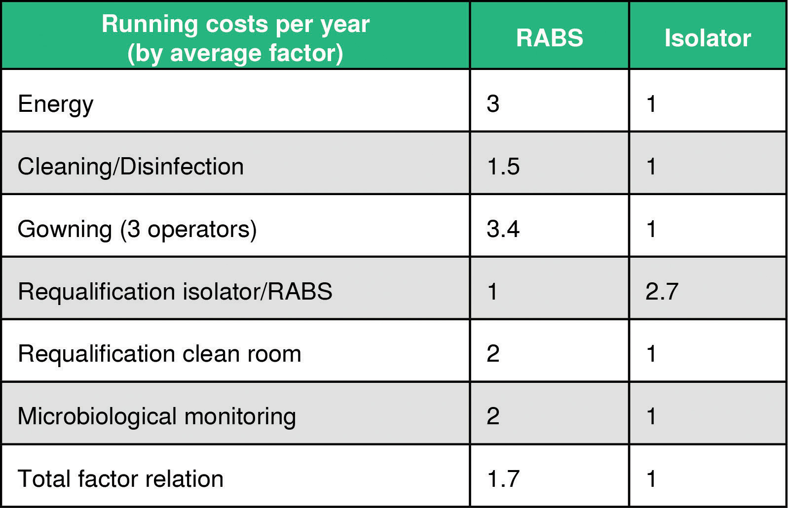 - The higher initial investment for an isolator can be covered well by lower running costs compared to RABS