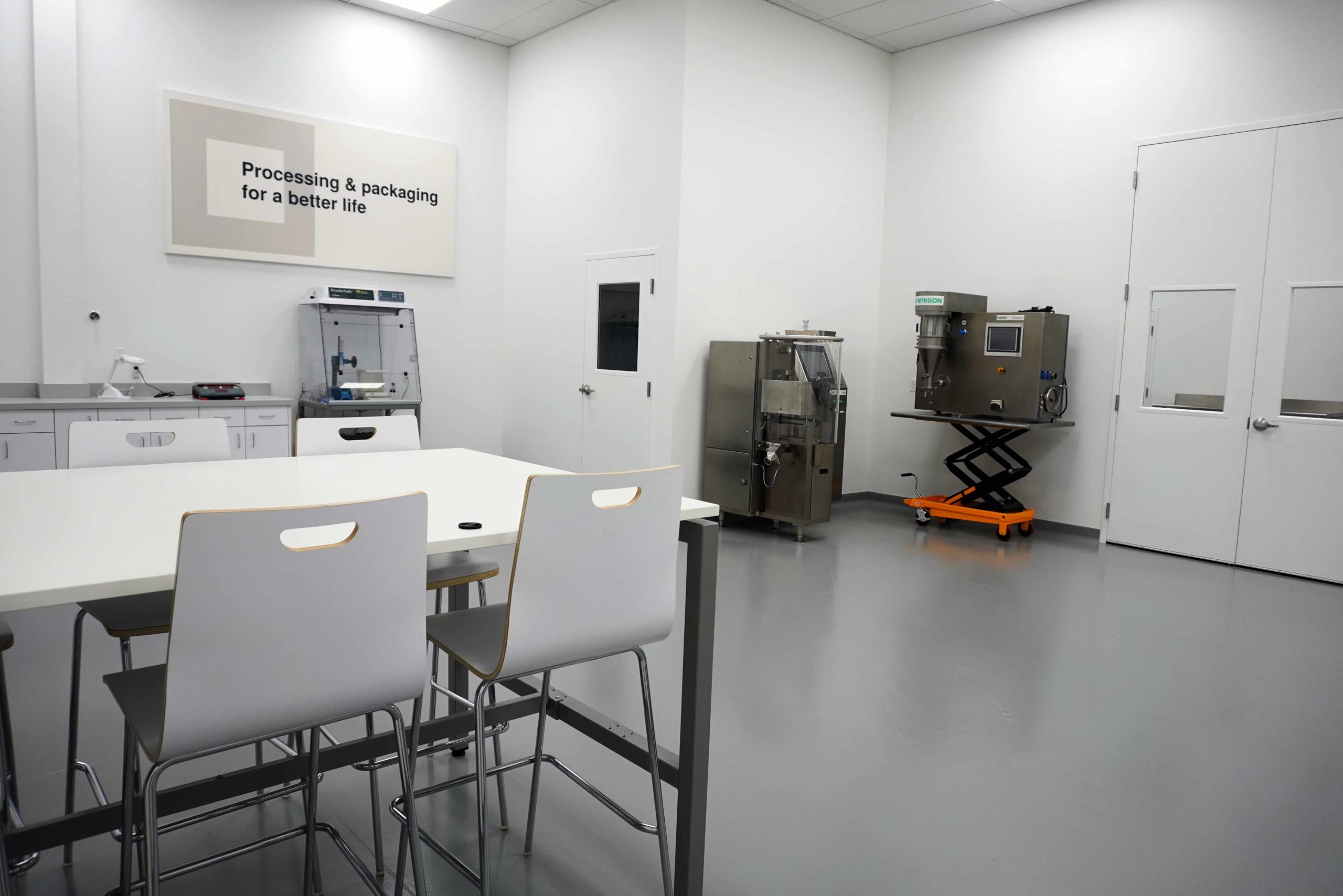 Continuing into the process suite, through a negative pressure gowning room, you enter the main lab space with the chosen Syntegon equipment and the necessary characterization equipment. The large room and excess utility capabilities allow for maximum flexibility and adequate room to observe the process. In the photos below we have our Solid Lab 2 Fluid Bed module set-up near the window. A storage room in the back allows for a dedicated space for any powder samples, ancillary equipment, and tools for the lab. Additionally there is a utility space accessible from the main shop floor. Visibility into this utility space is important because understanding the mechanism of a piece of equipment rarely ends at the product contact surfaces.